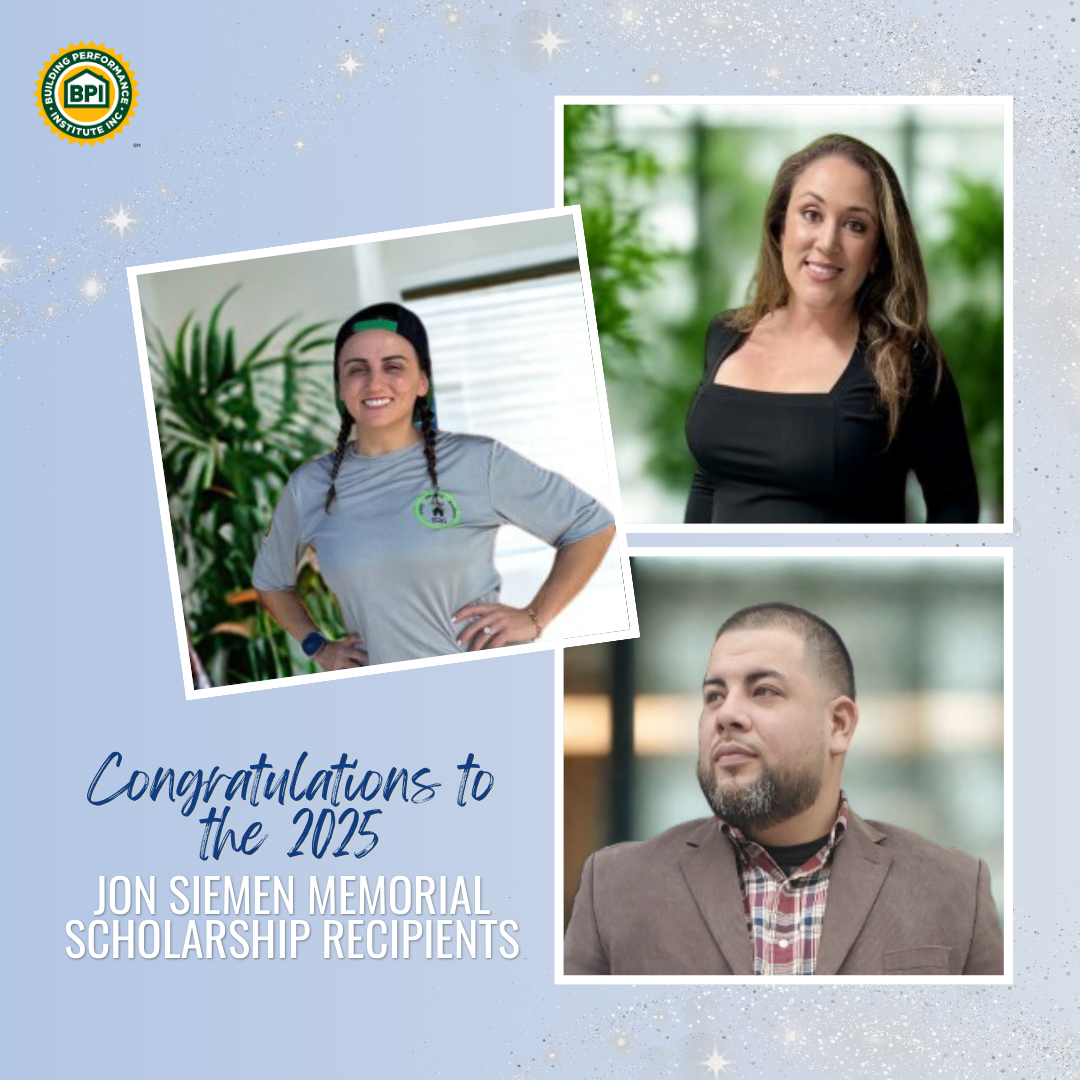 Saratoga Springs, NY - Building Performance Institute (BPI) is proud to announce the 2025 recipients of the Jon Siemen Memorial Scholarship. The Jon Siemen Memorial Scholarship honors the life and legacy of Jon Siemen, BPI’s dedicated Technical Relations Representative, who made a lasting impact on the building performance community before his passing in 2015. Each year, this scholarship supports four outstanding professionals by covering the costs of their BPI online and field exams, along with training and exam coordination.